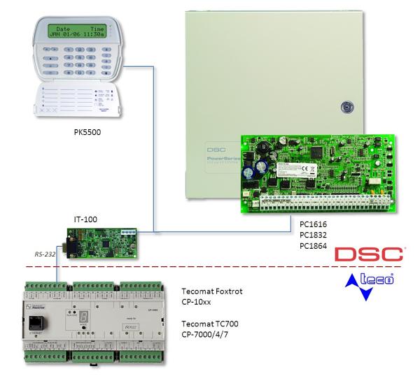 Princíp pripojenia spočíva v cyklickom monitoringu všetkých stavov čidiel/zón pripojených k DSC ústredni vrátane alarmov generovaných ústredňou a ďalšími jej stavmi. Stavy čidiel je tak možné v systéme Foxtrot využiť pre akúkoľvek ďalšiu logiku v inteligentnej inštalácii. Napríklad pre ovládanie osvetlenia, vykurovania a klimatizácie podľa údajov z čidiel pohybu v nestráženom alebo stráženom režime. Alebo pre doplnkové funkcie zabezpečovacieho systému – vygenerovanie alarmovej SMS, e-mail správy a pod. Pre pripojenie zabezpečovacej ústredne DSC k PLC Tecomat Foxtrot alebo TC700 je treba použiť modul IT-100 od DSC, ktorý tvorí interface na rozhraní RS-232 a je výrobcom určený pre spojenie ústredne so zariadeniami tretích strán. Na strane Tecomatu je potom možné použiť ktorýkoľvek sériový kanál s týmto rozhraním. Najjednoduchšie je použiť CH-1 napr. na základnom module Foxtrotu CP-1000, ktorý je týmto rozhraním už vybavený.